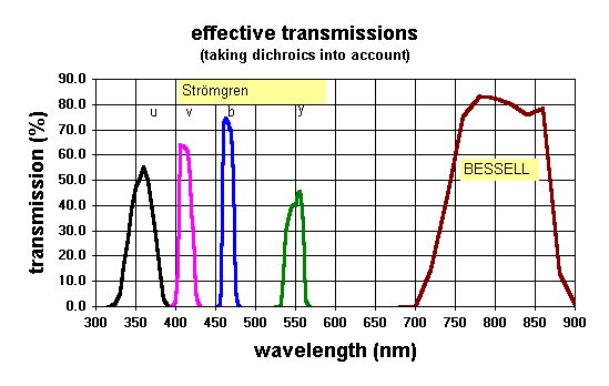 | The Four BUSCA wavebands. They are named - from left to right - uv, b, r, nir. Indicated are positons and widths of standard line, intermediate and broadband filters. Click here to get the ascii table of the Beam Splitter QE . | Effective tansmission of the available Strömgren and broad band filters (CCD QE not included). Now, H beta (wide) and H beta (narrow) are also available. (To get the ascii table click on the picture.) |