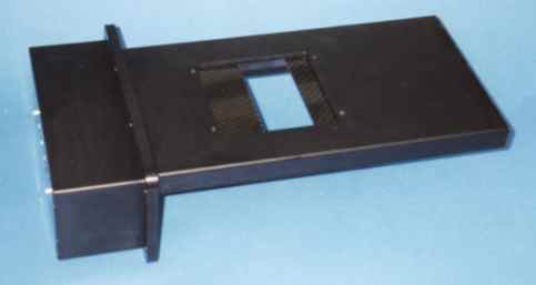 | The shutter is a removable drawer-like unit. The flat part is inside the instrument housing (the cube) and the left hand side box (with motors/encoders) outside. | Shutter interiors: Visible are the two carbon fiber blades, the linear ball bearing rails and the toothed belts. |