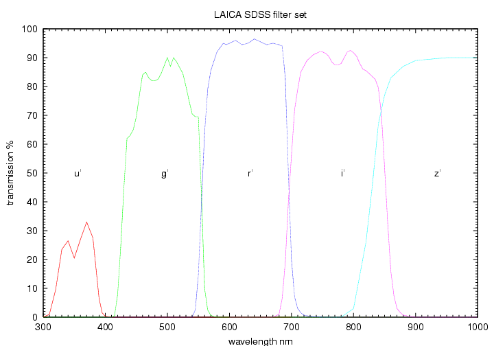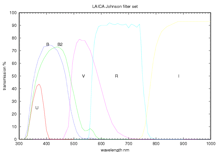 11 wide-band filters (left table, see transmission curves of Johnson- and Sloan filters) and 20 medium-band filters (colored bands overlayed over SDSS bands in black, full optics + atmospheric transmission) designed for the ALHAMBRA cosmological survey.LAICA Alh filterset