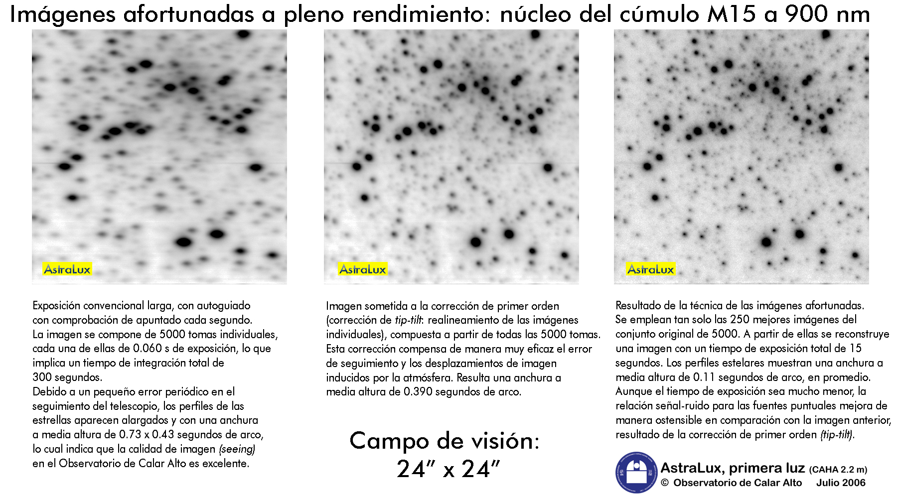 AstraLux, un instrumento simple y nuevo desarrollado en el Instituto Max Planck de Astronomía en Heidelberg, ha demostrado en Calar Alto su capacidad para registrar imágenes astronómicas extremadamente detalladas, con una resolución comparable a la de algunas vistas tomadas por el telescopio espacial Hubble. Este nuevo instrumento soslaya los efectos indeseados de la atmósfera terrestre, que tiende a emborronar las imágenes. Para ello AstraLux usa una cámara de alta velocidad que capta los instantes en los que la visión de los objetos astronómicos aparece menos afectada por la turbulencia del aire. Se obtienen así imágenes mucho más detalladas, en las que la borrosidad provocada por la atmósfera se reduce de un modo espectacular. Este proceder recibe en astronomía el nombre de técnica de las "imágenes afortunadas". Afortunadas porque la imagen final se compone a partir tan solo de esos momentos de suerte en los que las condiciones atmosféricas son óptimas.