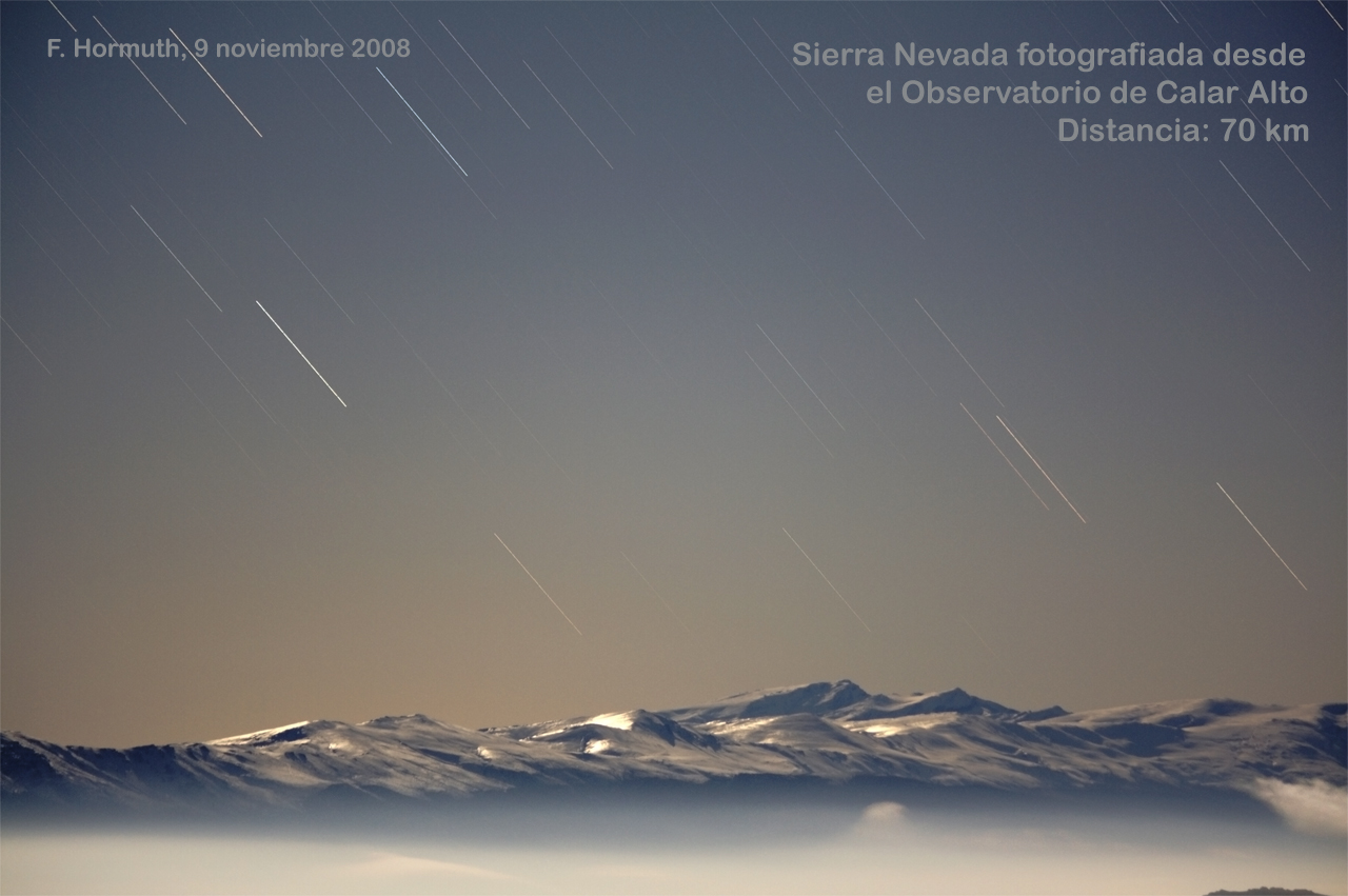 La primera de las dos imágenes se obtuvo el 9 de noviembre de 2008 desde la pasarela del telescopio de 2.2 m, mirando hacia poniente, y muestra los picos de Sierra Nevada cubiertos de nieve, alumbrados de noche por el claro de Luna. La cima más destacada es el Mulhacén, el punto más elevado de la peninsula Ibérica (3482 m). El tiempo de exposición total de esta imagen es de 5 minutos, lo que hace que las estrellas aparezcan con forma de trazos debido a la rotación de la Tierra. Esos trazos se mantienen visibles casi hasta el mismísimo horizonte, lo que demuestra la excelente trasparencia del aire. En la parte inferior de la fotografía se aprecia una capa de nubes estancada muy por debajo de las montañas, rellenando el valle del río Nacimiento que separa Sierra Nevada de los Filabres, donde está emplazado el Observatorio de Calar Alto.