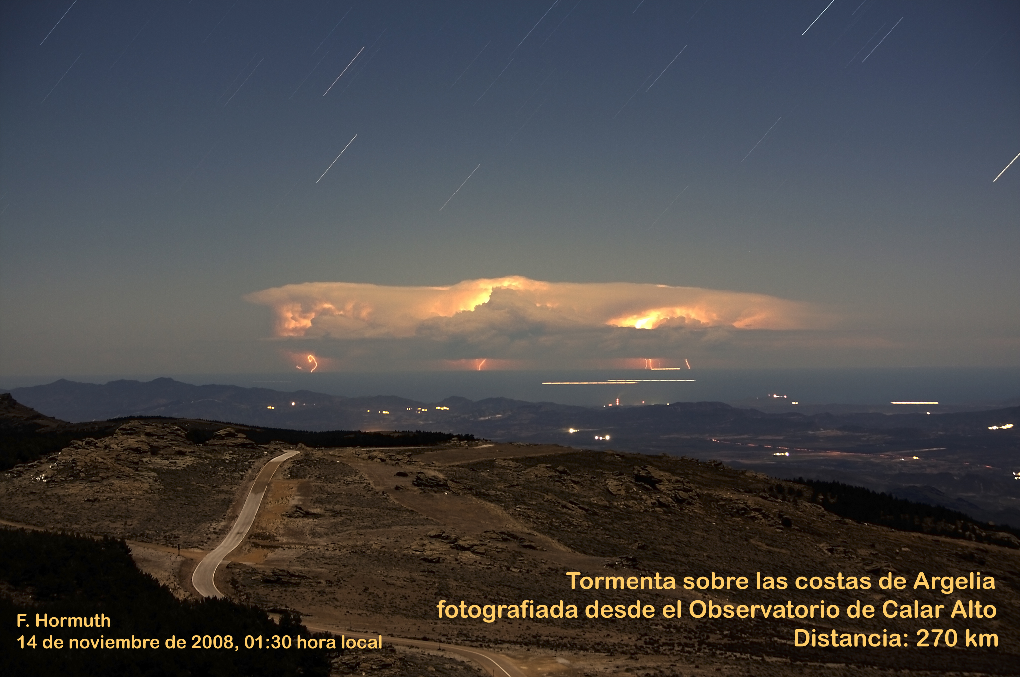 La segunda imagen se tomó en las primeras horas del día 14 de noviembre de 2008, en una noche sin nubes y también bajo el claro de Luna, pero mirando en la dirección opuesta (este-sudeste). En este caso el horizonte queda definido por el mar a una distancia de unos 170 km. Se distinguen con toda claridad los detalles de la costa local, a 65 km, así como los barcos navegando en el Mediterráneo (y que aparecen como trazos debido al prolongado tiempo de exposición). Por encima de la escena se alza una nube de tormenta gigantesca. Aunque quizá parezca cercana, en realidad estaba ubicada en las costas de Argelia, cerca de la ciudad de Mostaganem, a 270 km de Calar Alto. El emplazamiento de la nube se dedujo a partir de imágenes del satellite Meteosat, y su distancia se confirmó de manera independiente considerando que una altura típica par alas nubes de tormenta, 10 km. Esto implica que los rayos se prolongaban por debajo del horizonte local, y que probablemente no estaban cayendo sobre el mar, sino sobre el continente africano.
