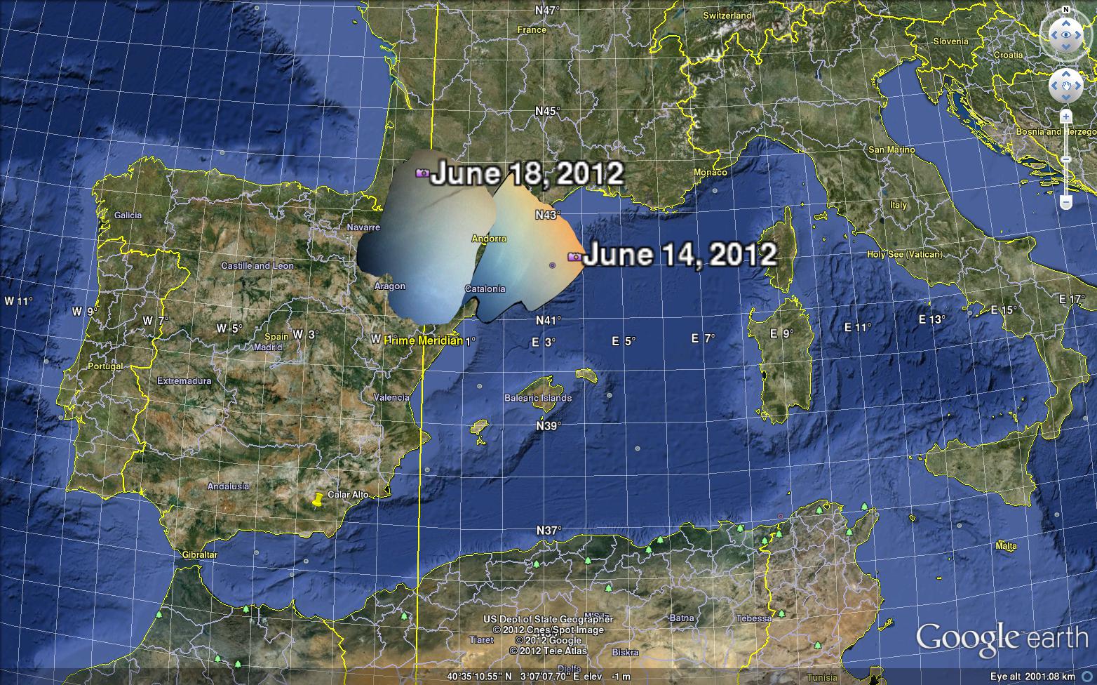 Enlace a un archivo para Google Earth que represent alas posiciones estimadas par alas nubes noctilucentes observadas desde Calar Alto el 14 y el 18 de junio de 2012