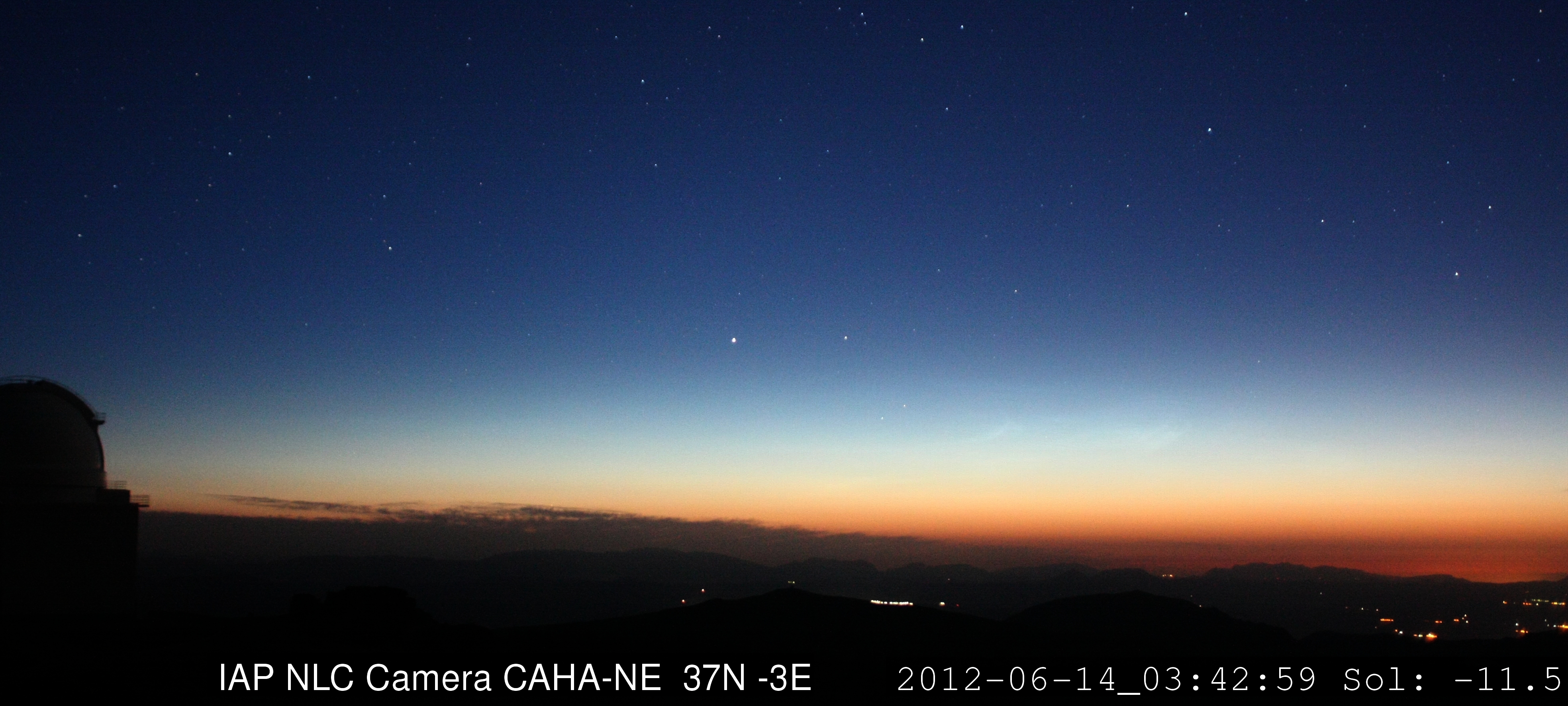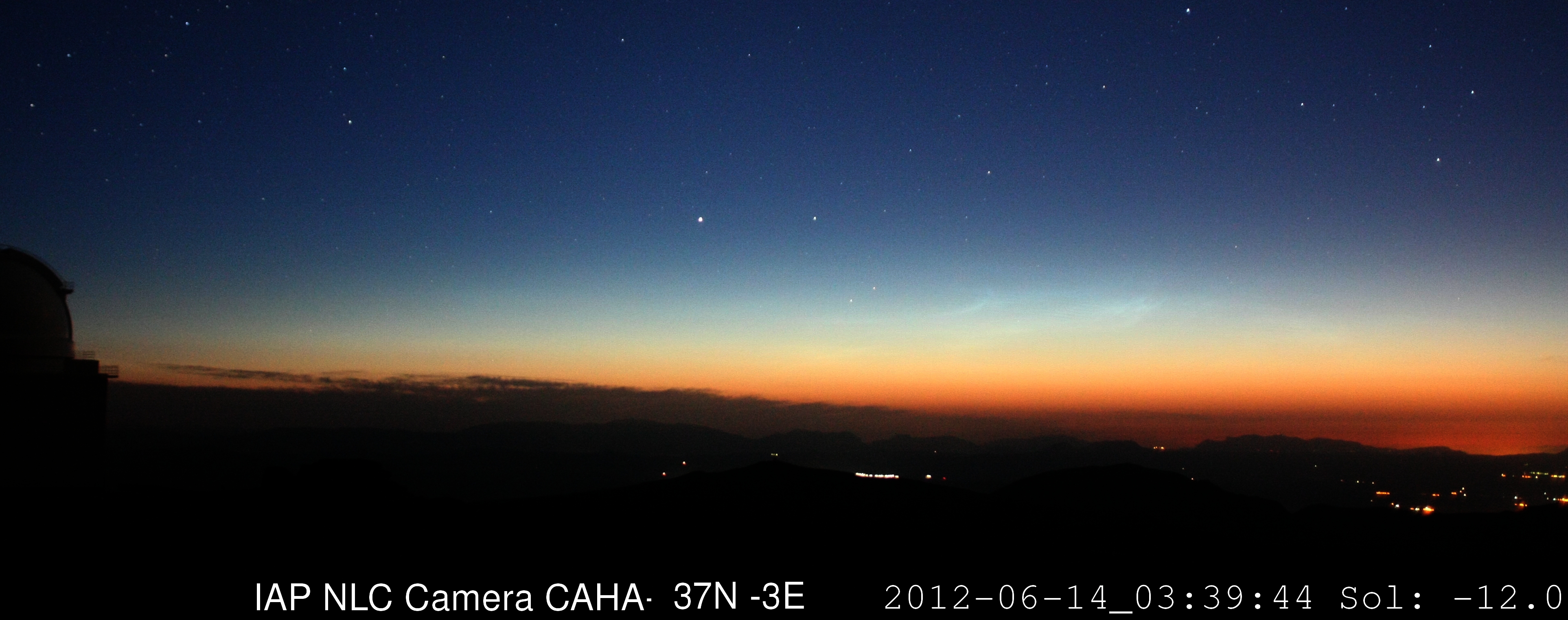 Tras cinco años de observaciones desde el Observatorio de Calar Alto, el equipo alemán dirigido desde el Instituto Leibniz de Física de la Atmósfera (IAP) ha logrado localizar nubes noctilucentes en las tardes de los pasados días 14 y 18 de junio de 2012. Los cálculos indican que las nubes estaban ubicadas sobre o ligeramente al sur de los Pirineos, la cordillera montañosa que separa Francia de España.