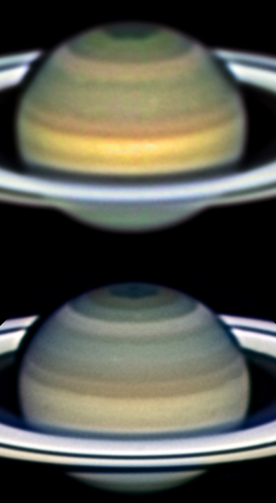 Saturno en imágenes obtenidas en 2013 con las cámaras PlanetCam y AstraLux en los telescopios de 1.23 m y 2.2 m del Observatorio de Calar Alto. El exágono configura el borde de la región oscura en el polo norte. Crédito: Grupo Ciencias Planetarias UPV/EHU.