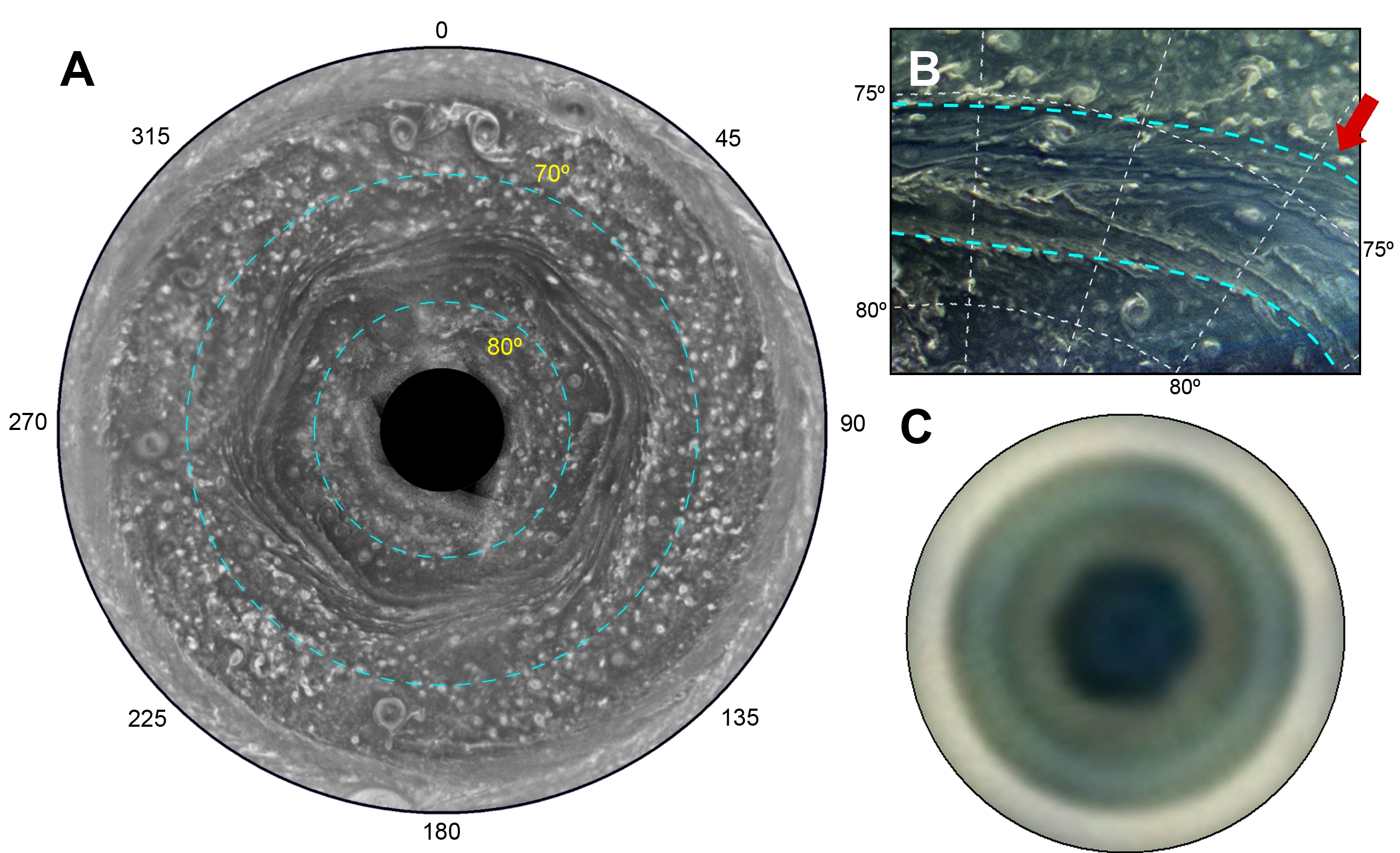 Mapas del polo norte de Saturno mostrando la estructura exagonal: (A) Cassini ISS (3 Enero 2009); (B) Detalle de las nubes del interior del exágono (Cassini ISS el 26 Agosto 2008); (C) Telescopio 2.2 m del Observatorio de Calar Alto: cámara Astralux (13-16 Julio, 2013). Crédito: Grupo Ciencias Planetarias UPV/EHU-Cassini NASA/ESA.