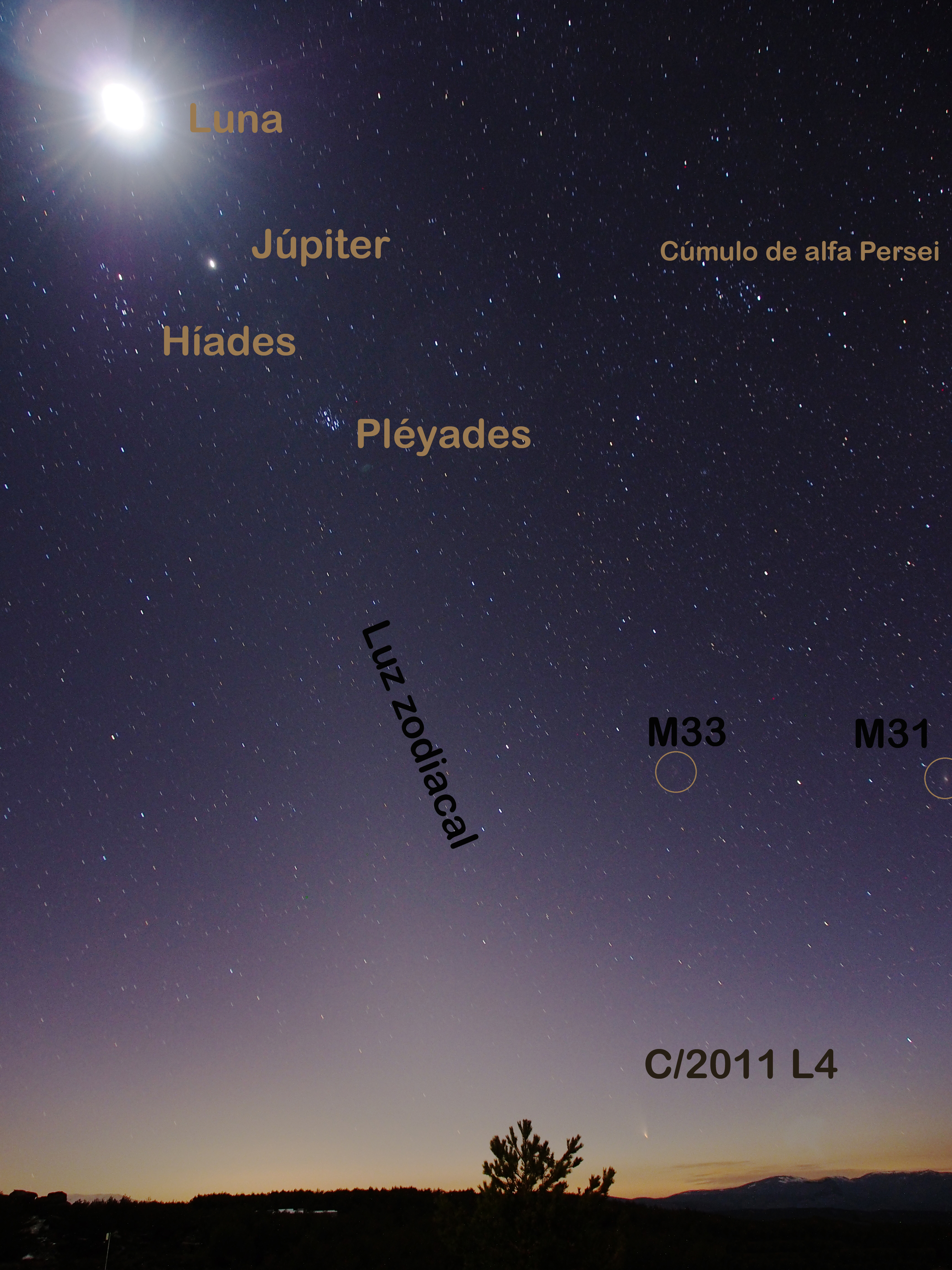 El experimentado astrónomo de Calar Alto Gilles Bergond obtuvo esta fotografía del cometa C/2011 L4 (PanSTARRS) el 18 de marzo de 2013. El cometa se aprecia con claridad cerca del horizonte occidental, arriba a la derecha del extremo superior del árbol. Pero el rasgo más llamativo de esta toma informal lo constituye la claridad y trasparencia sorprendentes del cielo en Calar Alto. La luz zodiacal, piedra de toque de la calidad de cualquier cielo de calidad astronómica, se extiende desde el horizonte y cruza la imagen hacia la esquina superior izquierda, ocupada por la Luna. La luz zodiacal es una nube lenticular de polvo interplanetario que brilla iluminada por el Sol. Esta banda difusa, mucho más débil que la Vía Láctea, solo puede verse bajo los cielos más limpios y su presencia en esta fotografía, incluso con luz lunar moderada, documenta la calidad del cielo en el Observatorio de Calar Alto, situado a 2168 metros sobre el nivel del mar en la Sierra de los Filabres, Andalucía (España).
