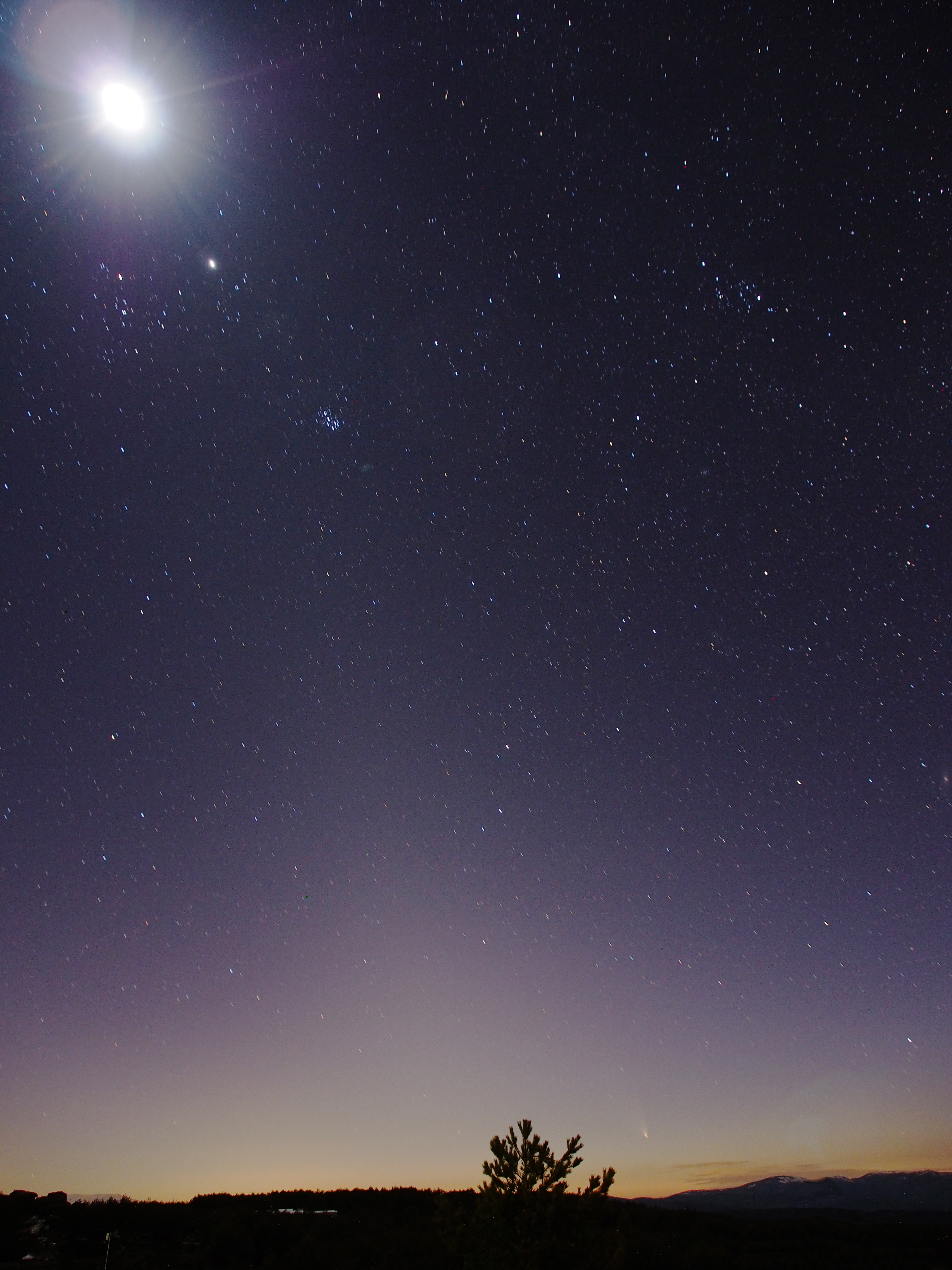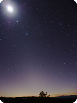The experienced Calar Alto astronomer Gilles Bergond took this photograph of comet C/2011 L4 (PanSTARRS) the 18th of March 2013. The comet is clearly seen close to the western horizon, right from the upper part of the tree. However, the most striking feature of this casual shot is the clearness and outstanding transparency of the sky at Calar Alto. The zodiacal light, touchstone of the quality of any astronomical-quality sky, extends from the horizon crossing the image towards the upper left corner, occupied by the Moon. The zodiacal light is a lenticular cloud of interplanetary dust, faintly glowing lighted by sunlight. This diffuse band, much fainter than the Milky Way, can be seen only under the clearest skies and its presence in this photograph, even under moderate moonlight, documents the quality of the sky at Calar Alto Observatory, placed at 2168 m over sea level at Filabres mountain range in Andalusia, Spain.