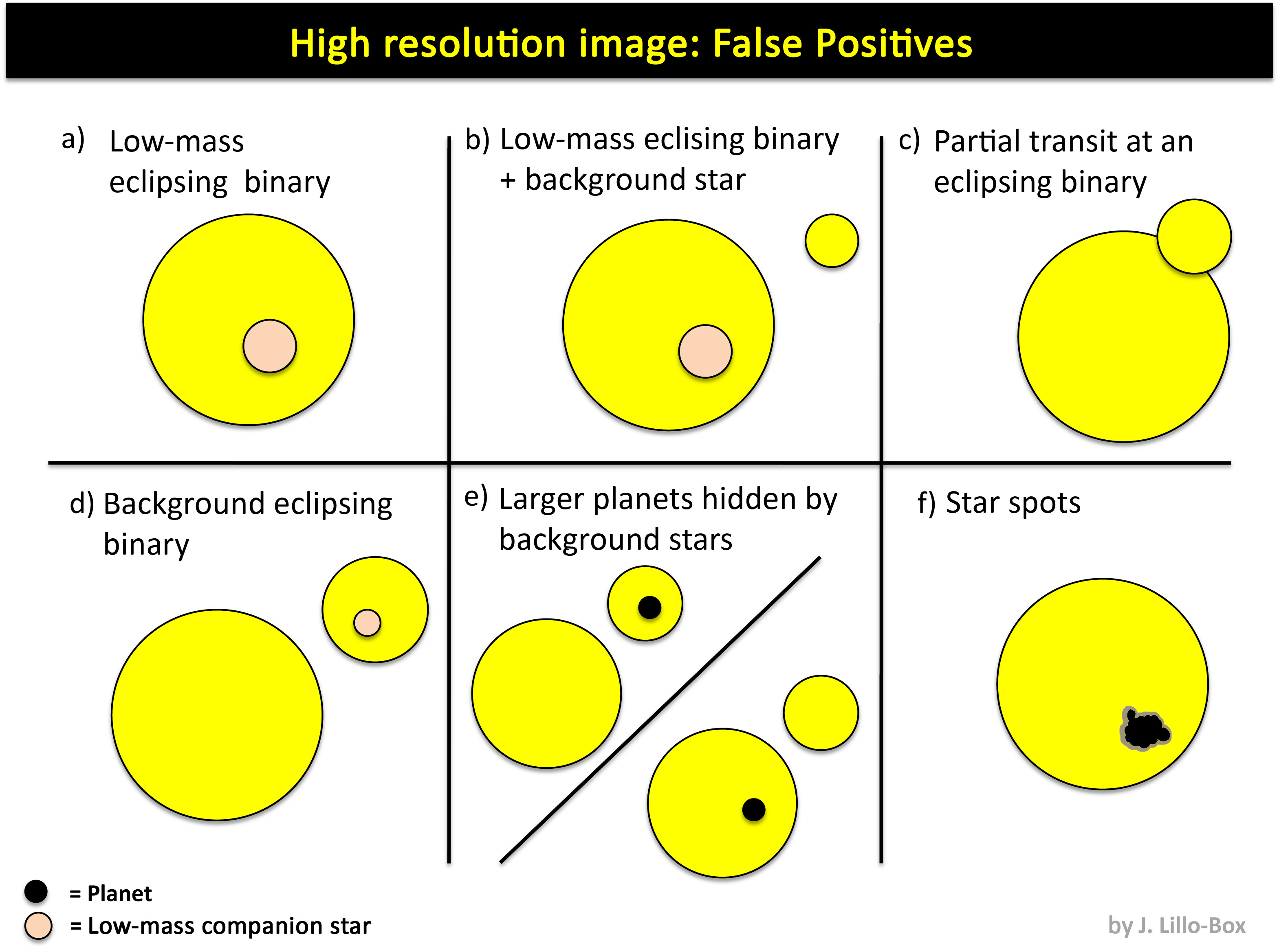Schematic diagram showing the configurations that may lead to false positives due to blending, in the search for planets by means of the transit method. (Click to enlarge.) |
