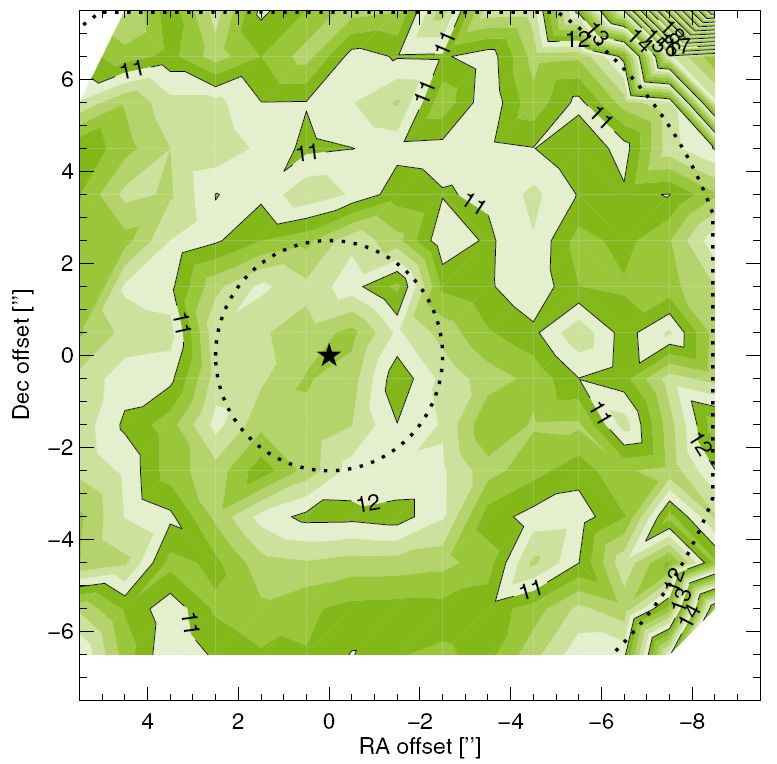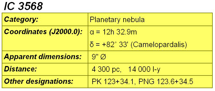 Electron temperature map of IC 3568 in units of 1000 K. The small dotted cicle marks the inner rim of the nebula, and the outer dotted curve marks the shell-halo transition. Figure 13 from A&A 486, 545-567 (2008)  (86 Kb)