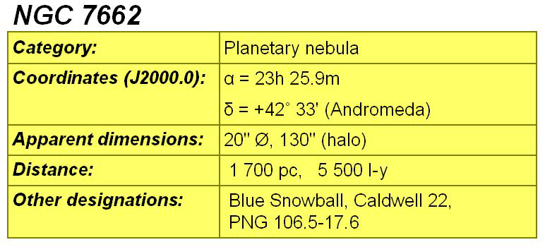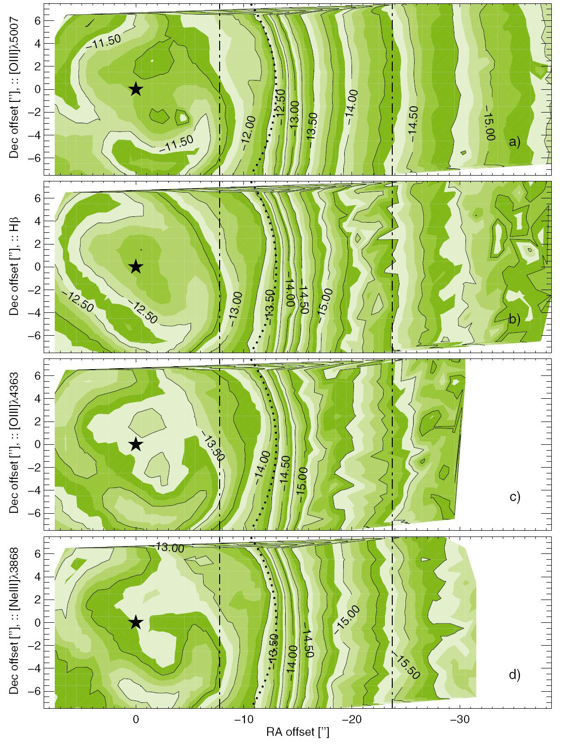 Surface brightness map of NGC 7662 in four emision lines (OIII at 500.7 nm , H-beta, OIII at 436.3 nm, and Ne III). The dotted curve marks the shell-halo transition. Figure 7 from A&A 486, 545-567 (2008) (633 Kb)