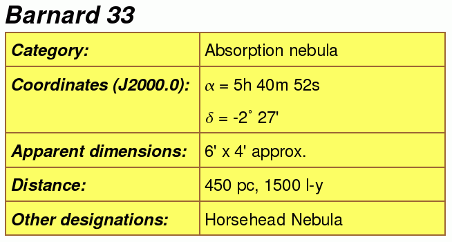 horse_head175The famous HorseHead Nebula in Orion (also known as Barnard 33) as seen from Calar Alto. This unusual shaped nebula was first spotted in 1888 on a photographic plate taken at the Harvard College Observatory. The nebula is located just below Alnitak, the easternmost star of Orion's Belt, lies at a distance of about 1500 light-years from Earth, and is approximately 3.5 light-years wide. The red glow originates from hydrogen gas predominantly behind the nebula, ionized by the nearby bright star Sigma Orionis. The darkness of the Horsehead is caused by tiny...