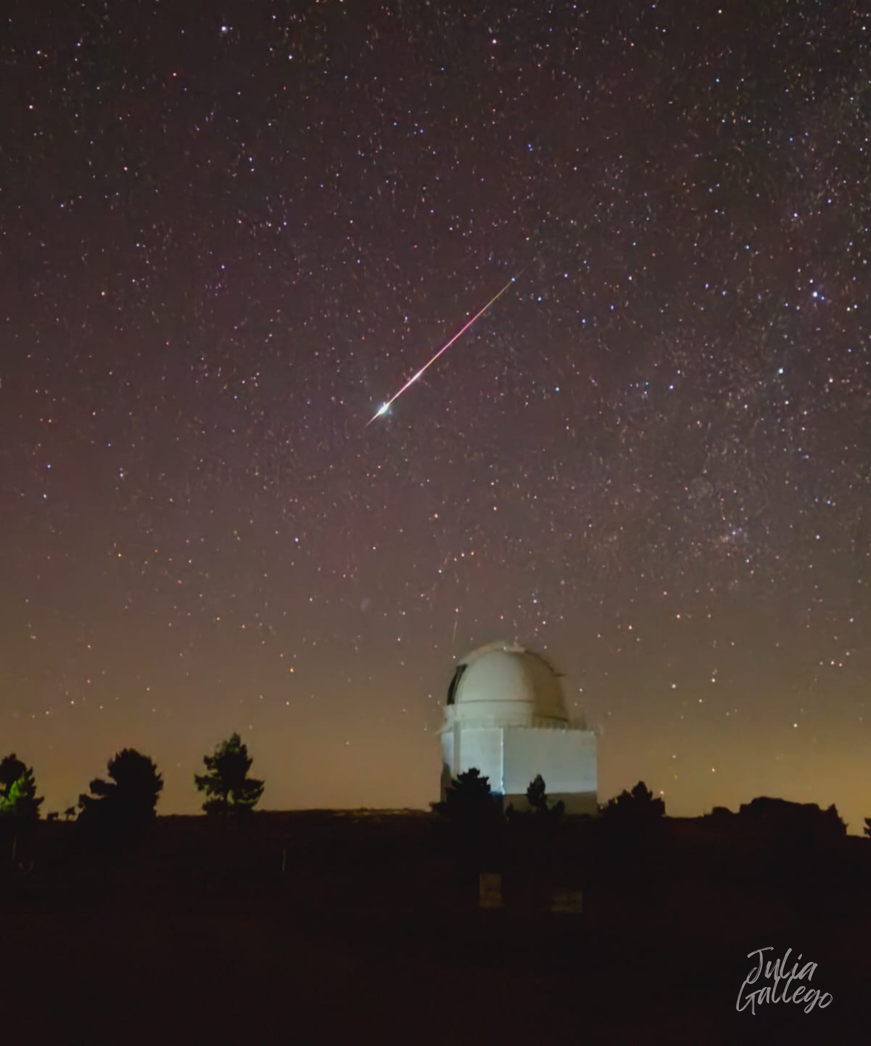 In the image on the right, taken by our colleague Julia Gallego, we can see the dome of the observatory’s 2.2 m telescope, whose visibility is compromised by the powerful lights of a vehicle on the ground that hinder astronomical observations (unfortunately, something all too common). Just above it, the fireball crosses the sky leaving a bright trail that underscores the contrast between the astronomical facility and the fleeting passage of the meteoric phenomenon. This moment reflects both the majesty of the night sky and the challenge of safeguarding observation quality against sources of light pollution.