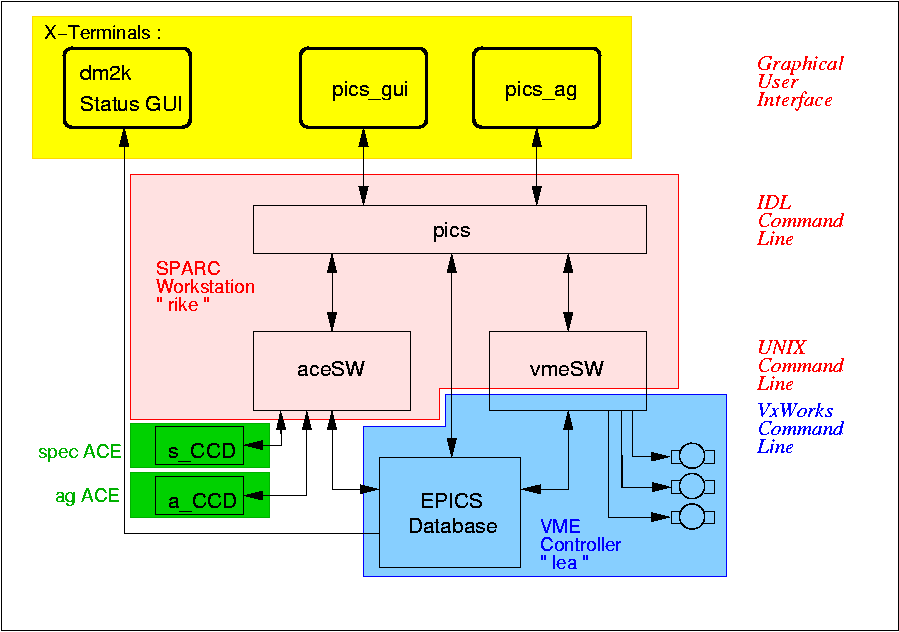 Instrument Control Computer (SPARC Station rike ) VME Motor Controller lea ) Spectrograph CCD Controller spec ACE ) A&G Camera CCD Controller ag ACE ) Data Storage and Archiving PC (pmas)
