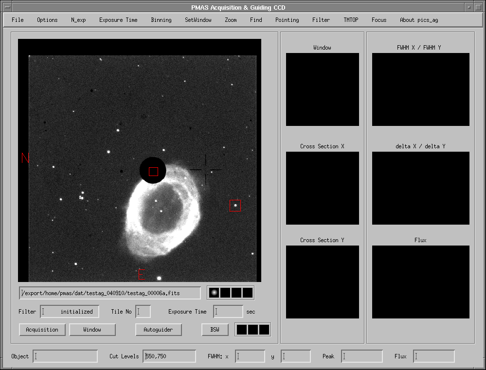 PMAS A&G Camera graphical user interface. The image shows a typical acquisition frame as obtained when the telescope has slewed on-target, encompassing a 3.4 x 3.4 arcmin^2 field-of-view. Technically, it is created by observing a slightly tilted mirror in the focal plane of the telescope, whose central part contains a diaphragm to transmit the on-axis light further down towards the IFU. The IFU field-of-view is outlined by the red square in the middle of the dark diaphragm area. The square is twice as large when the 1arcsec/spaxel magnification has been selected (default: 0.5 arcsec/spaxel). The second square to the right indicates the position of a guide star which can be selected with a simple mouse click. The guide star coordinates can be saved to disk. Restoring these coordinates allows one to repeat observations in another night with sub-arcsec pointing accuracy (note however the importance of A&G camera filter selection and the effects of differential atmospheric refraction). The image can also be plotted in a reverse greyscale, stored as a postscript file for future reference, or sent to the printer. Accurate centering of the IFU is performed by selecting the desired target region with a mouse click (pulldown menu "Pointing", assisted with zoom window to the upper right) ... (STEP 1)